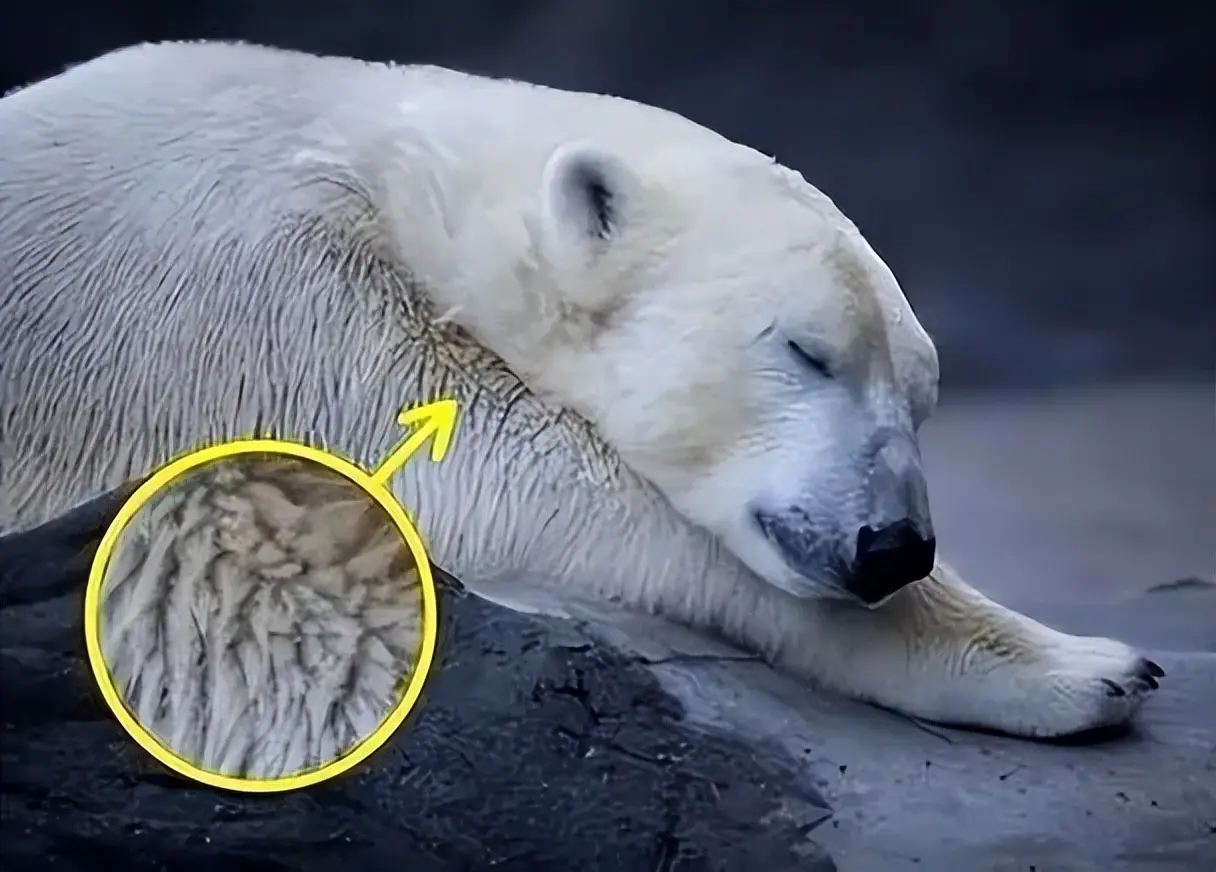 还有毛发结构。北极熊的毛看起来是白色的,其实每一根都是透明的中空管状结构。这种结构有两个作用:一是保温(中空管道里的空气是极佳的隔热层),二是导热——阳光可以穿透透明的毛发,直接照射到黑色的皮肤上,被吸收为热量。这是一套"被动式太阳能采暖系统",不需要消耗任何能量。
