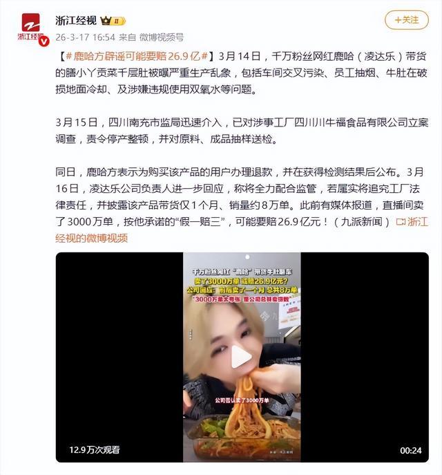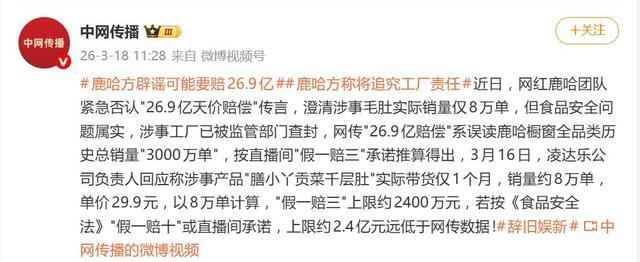 然而,鹿哈团队在回应中给出了另一组数据。他们解释,网络上流传的3000万单,其实是其抖音橱窗内所有品类商品的历史累计总销量,而并非单指这款毛肚。涉事的“膳小丫贡菜千层肚”实际带货周期仅约一个月,真实销售量约为8万单。以产品单价29.9元计算,即便执行“假一赔三”,赔偿上限也仅在2400万元左右,与网传的数十亿相差甚远。