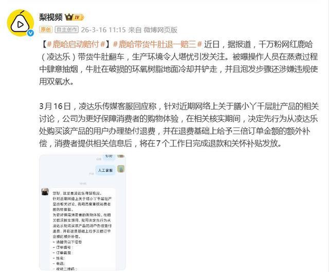 面对产品质量争议,鹿哈团队的行动堪称迅速。自3月16日起,他们已启动先行垫付方案:为所有购买该毛肚的消费者办理全额退款,并额外支付订单金额三倍的补偿。团队表示,赔付工作将在7个工作日内完成,目前已有部分消费者收到了退款和补偿。初步预估,此次赔偿总规模将在千万元级别以内,最终确切金额需待官方检测结果公布后才能确认。