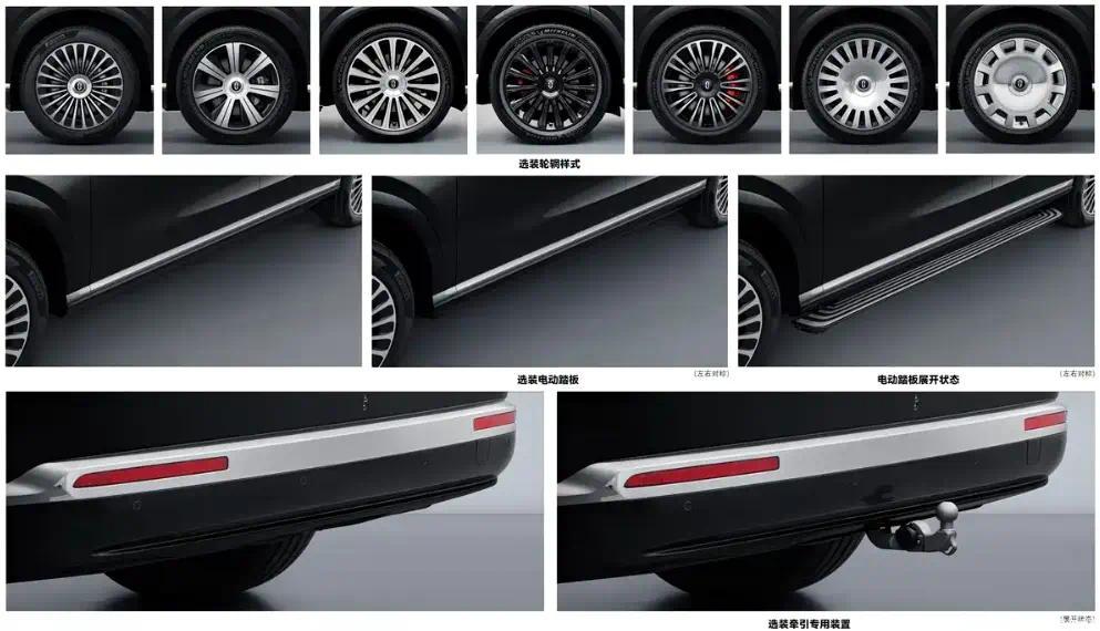 尾灯以及后包围处也增加了银色镀铬装饰条。尾灯将支持智慧灯语功能。新车可选装不同样式的轮毂、电动踏板、牵引专用装置等。